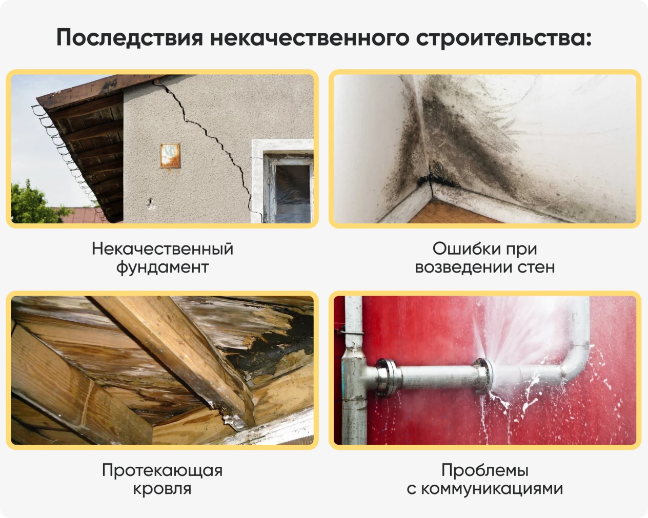 - Дефекты фундамента вызывают усадку и риск разрушения конструкции.