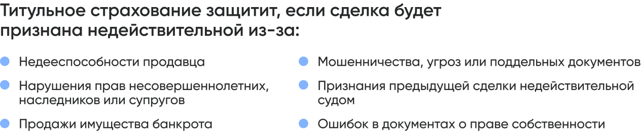 Чтобы минимизировать финансовые потери, рассмотрите страхование титула. Это особый вид страховки, который защищает покупателя, если право собственности на квартиру оспорят после покупки. Например, может объявиться наследник, бывший супруг или собственник, которого не учли при продаже. Если суд признает сделку недействительной, страховая компания компенсирует стоимость квартиры или расходы на юристов.