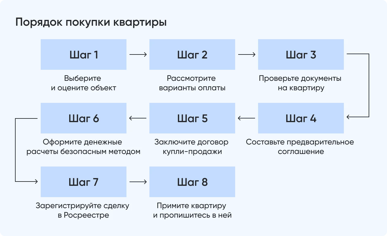 В предыдущем шаге мы выбрали идеальную квартиру, теперь разбираемся, как ее купить. Чтобы покупка жилья прошла без рисков, действуйте по четкому плану — от подписания договора до передачи денег и регистрации права собственности.