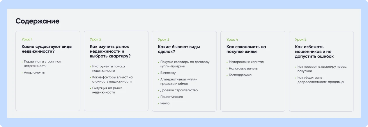 В бесплатном курсе по покупке недвижимости разобрали, какие бывают виды сделок: по договору купли-продажи, в ипотеку, по договору участия в долевом строительстве или на торгах. Переходите в отдельный урок, чтобы разобраться в нюансах сделок, или проходите весь курс — изучение займет всего час.