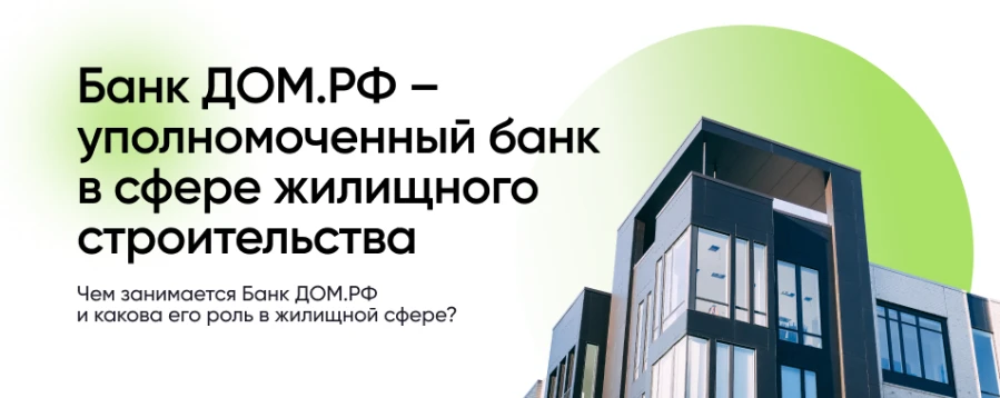 Банк ДОМ.РФ является уполномоченным банком в сфере жилищного строительства, который создан по поручению Президента России. К основным задачам банка относится реализация федеральных и региональных программ льготной ипотеки, внедрение проектного финансирования в долевом строительстве. Также банк является агентом Фонда развития территорий и выплачивает компенсации участникам долевого строительства, пострадавшим от действий недобросовестных застройщиков.