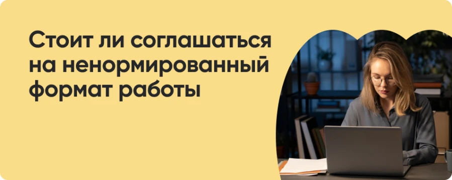 Формат означает, что время от времени руководитель может попросить вас прийти пораньше или задержаться вечером. Продолжительность и рабочий распорядок ненормированного дня устанавливается трудовым договором — вы подписываете этот документ при оформлении на новое место. Обязательно обращайте внимание на этот пункт.