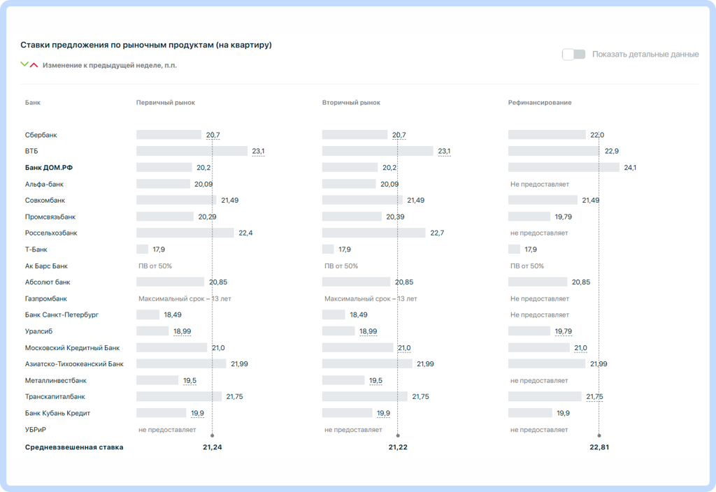 По отношению к прошлой неделе средневзвешенные ставки по рыночным продуктам остались на уровне 21,24%.