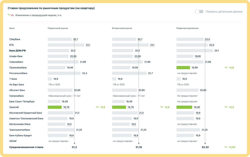 По отношению к прошлой неделе средневзвешенная ставка снизились до 21,2% (новостройки). Ставки на индивидуальные дома остались прежними. Уралсиб снизил ставку на 0,5 п.п. до 18,49% (первичный и вторичный рынок), а также до 19,49% по рефинансированию. Промсвязьбанк снизил ставку по рефинансированию на 0,8 п.п. до 18,99%.